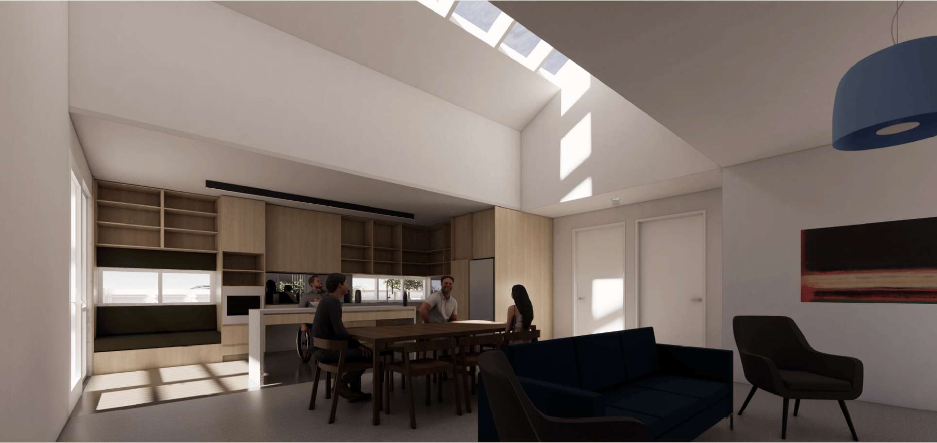- Modern kitchen with accessible bench spaces and breakfast bar